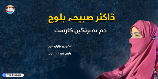 اگاں مارچ کنوک بیدء وتی گار ءُ بیگوائیں مَردمانی پَد جَنگ ءَ ھُشکیں دستاں گوں واتر بنت ۔ بَلے صبیحہ آیانی دلانی میان ءَ اوست ءُ اُمیت ءِ یک چراگے بالینگءَ اَت ۔ پیسر ءَ بلوچ نودربرانی گَل بلوچ اسٹوڈنٹس ایکشن کمیٹی (BSAC) ءِ چیئرپرسن بوتگ، ءُ انوں بلوچ یکجہتی کمیٹی ءِ بنجاہی رھشون اَت۔ ڈاکٹر صبیحہ ءَ یک انچیں سَپرے ءَ رہادگ اِنت کہ اے راہ ءَ ھزاراں جیڑہ ءُ جنجال ھَست اَنت۔