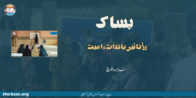 وھد یکہ من بساک ءِ نام ءَ اِشکُناں ءُ آئی ءِ کاراں گنداں گڑا من ءَ امیت ءِ یک رُژنائیں بامے گندگ ءَ کیئت کہ اود ءَ دربرگ ءِ امیت ،سکگ ءِ امیت، عمل کنگ ءِ امیت ءُ درستاں مستریں امیت ھمیش انت کہ راج زانشتی پِڑ ءَ یک منزلے ءَ سر کنگ بہ بیت۔ اے ھما امیت انت کہ من گوْشاں من ءُ منی وڑیں نازانتیں نودربرے ءَ ھم دربرگ ءِ سنچ دئینت۔ من برے برے سما کناں کہ منی جند بساک ءِ لائک نہ اِنت ،بساک من ءَ چہ گیش شوکتر ءُ زانتکاریں سنگت کرزیت بلے چوشکہ من گوْشت کہ بساک امیت ءِ نام اِنت، ھمے امیت کہ من ءَ بساک ءِ تہ ءَ جاگہے داتگ ءُ منی زمیر ءَ گوْش ایت کہ تو اگاں بساک ءَ ھوار نہ بئے گڑا کجا روئے، آ کجام جاہ اِنت کہ ترا سوج بہ دنت ءُ بہ گوْش ایت کہ جھد بہ کن، ھرچ چیز پہ جھد ءَ رند رسیت، جھد بہ کن ءُ گوں امیت ءَ جھد بہ کن، گوں مخلصی ءَ جھد بہ کن کہ ترا جنزگی اِنت ترا دیم ءَ روگی اِنت، پہ ورناھاں جھد بہ کن، پہ زھگاں جھد بہ کن ،پہ زالبولاں جھد بہ کن پہ پیر ءُ عاجزاں جھد بہ کن، پہ راج ءَ جھد بہ کن ءُ پہ وتی باندات ءَ جہد بہ کن۔ اگاں درستیں جُستانی جواب ءَ لوٹ ئے گڑا آ پتر(پلیٹفارم) بساک اِنت کہ منی وڈیں نودربرے ءَ اے چیزاں سوج دنت ءُ مدام ہر کشک ءُ در ءَ آئی ءِ رہشونیءَ کنت۔