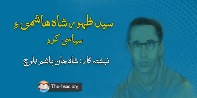 سید ظہور شاہ ھاشمی، کہ بلوچی لبزانک ءِ آسمان ءِ یک رُژنائیں استارے زانگ بیت، ایوک ءَ یک شائرے یا ادیبے نہ اَت، بلکیں یک مزنیں سیاسی ءُ راجی راھشونے اَت۔آئی ءِ ادبی ءُ سیاسی جہد یکے دومی ءَ گوں ھمگرنچ اَنت ءُ آئی ءِ نبشتانک ءُ شئیر آئی ءِ سیاسی ھیالانی درشان اَنت۔