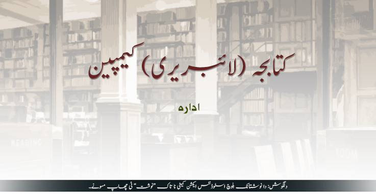کتابجہ (لائبریری) کیمپینادارہ دا اسے راستی اسے کہ منہ وخت مست بلوچستان ٹی خواننگ نہ ماحول بے کساس نزوری آتا آماچ مسونے،اگہ کس ئس سرپدی تخانے یا سرپد مسونے گڑا امو ورنا ک و لس مخلوق اچ وڑ خواننگ نا جیڑہ غاتا زیہا سوچ بچار کتنے۔دُن ہم اف کہ کسے …