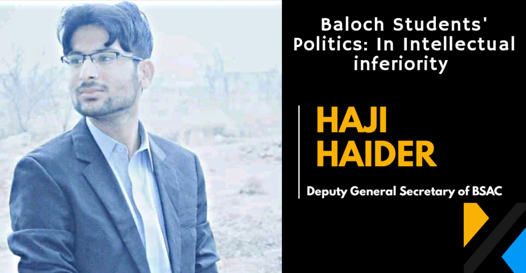 Baloch Students’ Politics: in Intellectual inferiority.Haji Haider(Deputy General Secretary Of Baloch students Action Committee) As Arundhati Roy wraps it well, “to those poor what peace means whose resources are being looted, and those whose daliy life needs aren’t water, house, and survival instead a survival of self-esteem, for them peace …