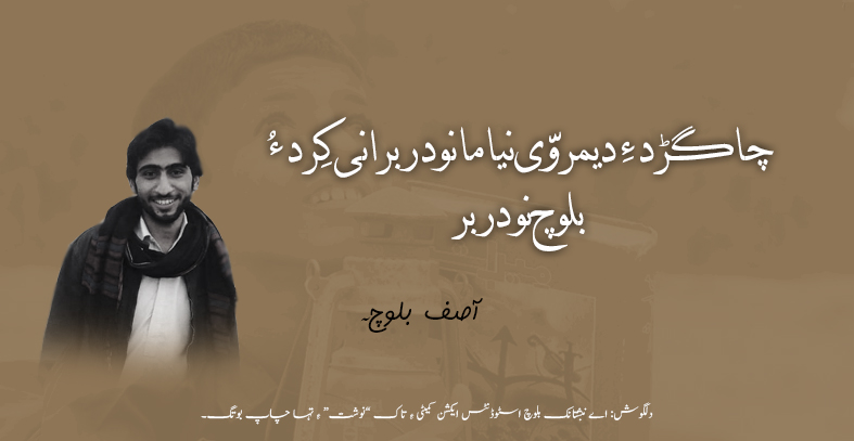 چاگڑدءِ دیمروّی نیاما نودربرانی کِرد ءُ بلوچ نودربرآصف بلوچ Asif-balochDownload دلگوش: اے نبشتانک بلوچ اسٹوڈنٹس ایکشن کمیٹی ءِ تاک ”نوشت“ ءِ تہا چاپ بوتگ۔