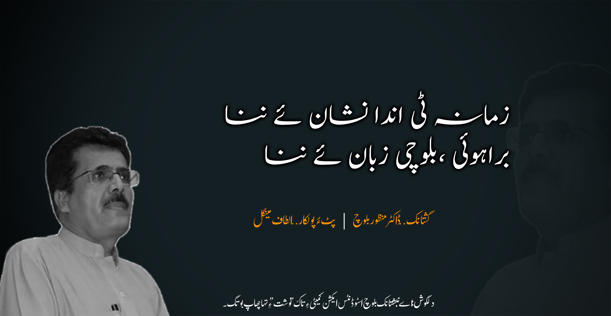 زمانہ ٹی اندا نشان ئے ننا۔۔۔براہوئی،بلوچی زبان ئے نناگشتانک.. ڈاکٹر منظور بلوچ | پٹ ءُپولکار.. الطاف مینگل اے گشتانک پروفیسر ڈاکٹر منظور بلوچ ءَ بلوچ اسٹوڈنٹس ایکشن کمیٹی ءِ اولی کونسل سیشن ءِ سوگندی دیوان ءَ داتگ۔ اے گشتانک ءِ دُرستیں گپ ء ُ ھبر پروفیسر ڈاکٹر منظور بلوچ ءِ …