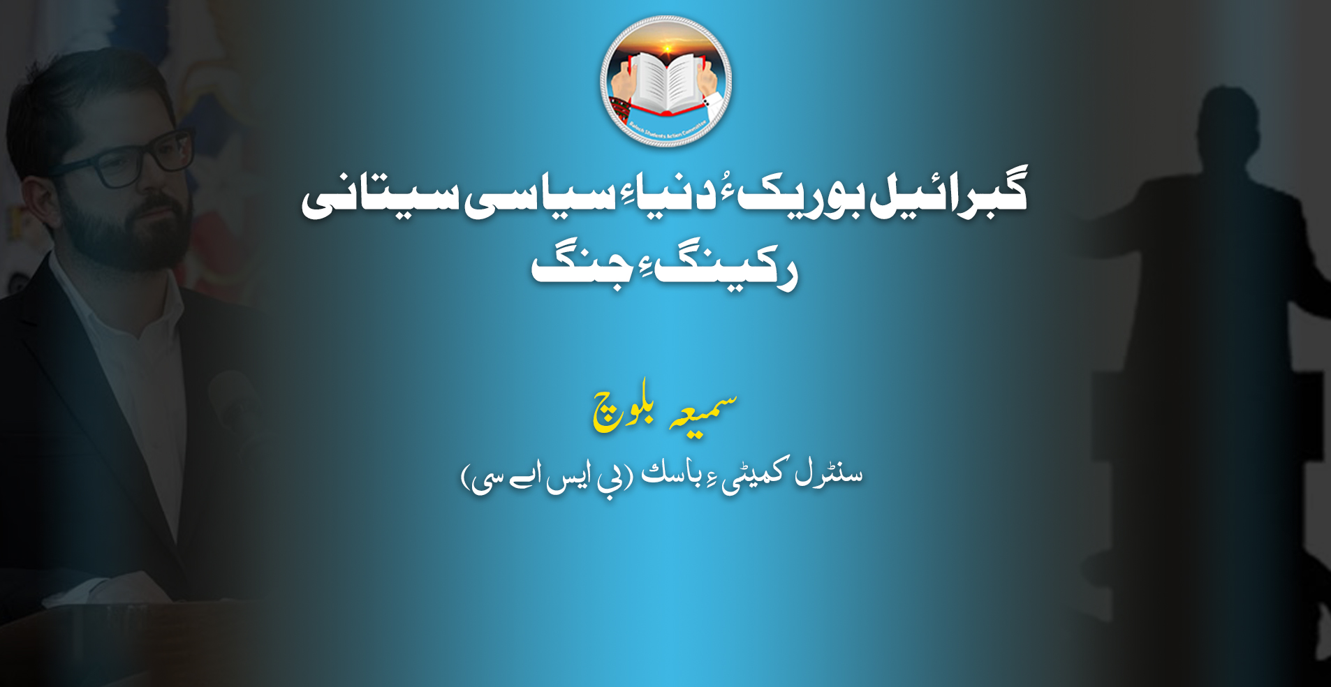 گبرائیل بوریکءُ دنیاءِ سیاسی سیتانی رکینگءِ جنگ سمیعہ بلوچ باسک سنٹرل کمیٹی (بساک) سیاست وتی سیتانی رکّینگ ءِ نام اِنت، ءُ ریاست ءِ نپّ آئی تاگت ءِ برجم دارگ اِنت کہ آ تاگت ایکونومیاں گوں بندوک اَنت۔ کالونائیزیشن ءِ دپتر اے گپّ ءَ وت گیشّین اِیت کہ وتی ایکنامی ءِ …