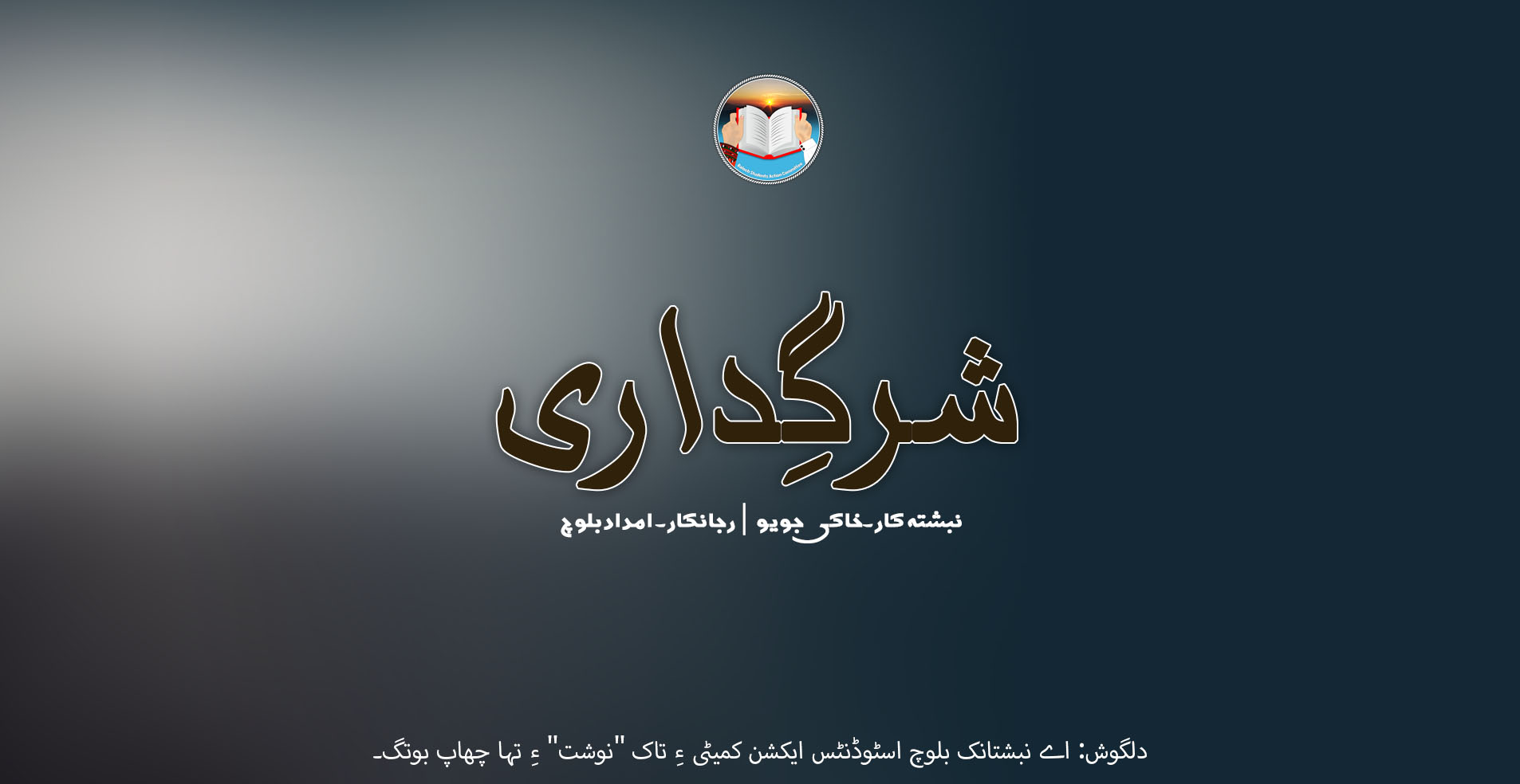 شرگِداری نبشتہ کار۔خاکی جویو | رجانکار۔ امدادبلوچ آشوبکاریں راجی ادارہ چہ شرگداریءَ نہ تُرس اَنت،ما چوشکہ آشوبی اِیں ءُ راستیءَ گوں ھمگرنچ اِیں پمیشکہ راجی تاکت بہ زان کہ لَس مھلوک مئے ھمبراہ اِنت۔ یک آشوبی یےءِ نہ تھنا پکر بگندئے آئیءِ بالاد ھم مُھکم بیت۔ آئیءَ اے سِتک ءُ …