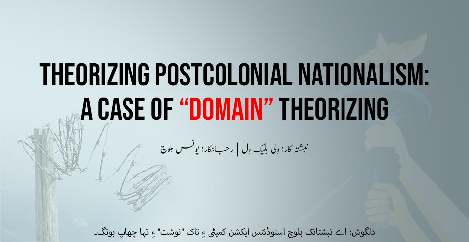 Theorizing Postcolonial Nationalism: A Case of “Domain” Theorizing نبشتہ کار: وِلی بلیک وِل | رجانکار: یونس بلوچ پوسٹ کالونیلئزم راجدوستی، راجدوستی لیکہ ءِ منوگریں راجانی چاگرد ءَ گوش اَنت۔ پوسٹ کالونیلئزم راجدوستی ھما راجانی چاگرد ءَ گوش اَنت کہ آ زوراکیں راجانی چیردست بوتگ اَنت۔ ھما چاگرد کہ راجدوستی …