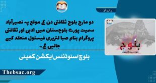 دو مارچ بلوچ ثقافتی دن کے موقع پہ نصیرآباد سمیت پورے بلوچستان میں ادبی اور ثقافتی پروگرام بنام صبا لٹریری فیسٹول منعقد کیے جائیں گے۔ بلوچ اسٹوڈنٹس ایکشن کمیٹی دو مارچ دنیا بھر میں بلوچ ثقافتی دن کے حوالے سے منایا جاتا ہے اسی دن کی مناسبت سے نصیرآباد سمیت …