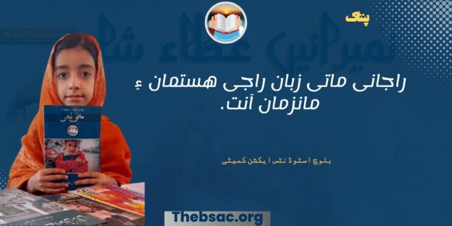 بلوچ ءِ ماتی زُبان مرچی جتائیں زبانانی نیمگ ءَ لگتمالی ءِ آماچ اَنت، دریں زُبان مئے زباناں ورگءَ اَنت۔ اے ایردستیں زبانانی زورآوری سکیں مزنیں بیھارے پرچا کہ اے نہ تہنا بلوچءِ زباناں مرگ آماچ کنگءَ اَنت بلکیں بلوچءِ جندءِ ھستمان ھم ترسءِ آماچ اِنت گوں۔ مئے ماتی زُباناں راج ءِ یاتگیریءُ مارشت ھوار اَنت کہ مارا بلوچ بوگ ءِ سکین ءَ دینت۔ مروچی ما پرچا لیاریءِ بلوچاں ایرجنیں کہ آیاں بلوچی زبان گاجیل کرتگ، پرچا کہ آیانی تچکءَ تچک زورگیرءِ زبان زرتگ، نہادیگءِ زبان اوں اردو اِنت، پمیشکہ لیاریءِ بلوچاں اردوءِ سانءَ بازیں چیزے گار کرتگ، اودءَ ھوار دگہ بازیں ھنداں بلوچ ربیدگ، رسم ءُ رواج مروچی پشت نہ کپتگ اَنت، مہمانداریءِ رواجءِ جند نیست، اجتماعیتءِ مارشتءِ جند پشت نہ کپتگ بزانکہ بلوچءِ کسان کسانیں رسماں بگر دانکہ مزنیں ربیدگ ءُ دودمانءَ بیا مروچی ھچ پشت نہ کپتگ ءُ ایشیءِ مستریں سبب اردو زبان اِنت۔ اگاں ما اے تیزگامیں دورءَ اردوءِ پیمیں کسانیں زبانےءِ ایردستیءَ وتءَ در کُت مہ کنیں گڑا ڈیجیٹل دنیاءَ گوں وتی ماتی زباناں ھمگام کنگءَ کرن درکار بنت۔ نوں اے کار ھمک بلوچ راجدوستیں گلاں وتی کساسءَ کوپگاں زورگی اِنت، بلے پریشیءَ بلوچءِ ھمک ورنا ءُ پُسگ نگیگیں جاوراں بلوچءِ ھمک ارزشداریں پڑاں مئےھمکوپگیءَ بہ اوشت اَنت۔ پرچا کہ راجانی زبان راجی ھستمانءِ مانزمان اَنت۔