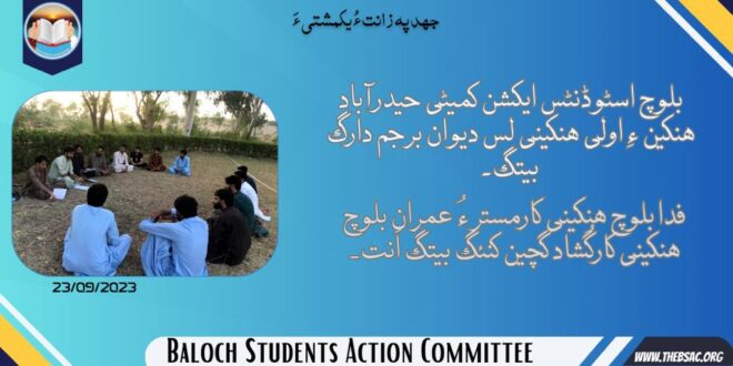 بلوچ اسٹوڈنٹس ایکشن کمیٹی حیدر آباد ھنکین ءِ ھنکینی لس دیوان ھنکینی کارمستر زبیر بلوچ ءِ سروکی ءَ برجم دارگ بیتگ، دیوان ءِ ھاسیں مہمان بنجاھی کمیٹی ءِ باسک سلیم بلوچ ءُ گچینی مہمان شیراز بلوچ بیتگ اَنت۔ دیوان ءَ بنجاھی سرکیولر، گوستگیں ھنکینی اھوال، شرگداری، گل کاری، ھندی ءُ میان استمانی سیاسی جاورھال ءُ آؤکیں گامگیج ءِ بنگپانی سرءَ گپ ءُ تران بیتگ۔