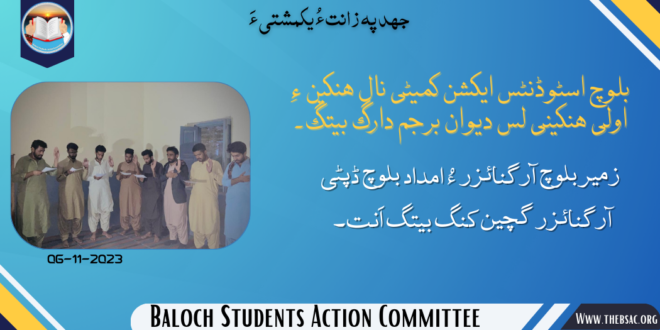 بلوچ اسٹوڈنٹس ایکشن کمیٹی نال ھنکین ءِ ھنکینی لس دیوان برجم دارگ بیتگ۔ زمیر بلوچ آرگنائزر ءُ امداد بلوچ ڈپٹی آرگنائزر گچین کنگ بیتگ اَنت۔