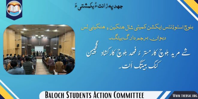 بلوچ اسٹوڈنٹس ایکشن کمیٹی شال ھنکین ءِ ھنکینی لس دیوان برجم دارگ بوتگ۔ شئے مُرید بلوچ ھنکینی کارمستر ءُ فھد بلوچ ھنکینی کارگُشاد گچین کنگ بُوتگ اَنت۔