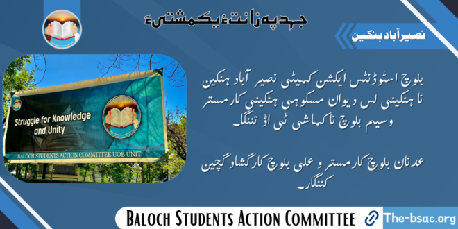 بلوچ اسٹوڈنٹس ایکشن کمیٹی نصیر آباد ہنکین نا ہنکینی لس دیوان مسکوہی ہنکینی کارمستر وسیم بلوچ نا کماشی ٹی اڈ تننگا۔