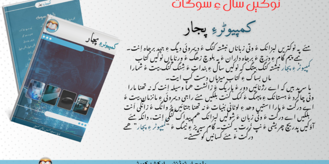 چہ بلوچ اسٹوڈنٹس ایکشن کمیٹی ءِ نیمگ ءَ اولی رند ءَ بلوچی زُبان ءَ کمپیوٹر ءِ سر ءَ کتابے “ کمپیوٹر ءِ پجار” ءِ نام ءَ چاپ ءُ شِنگ کنگ بیگ ءَ اِنت۔ گل ءِ بنجاہی جارکش ءَ رسانکدر ءَ درشانے ءَ گوشتگ کہ مئے پہ نوکتریں لبزانک ءُ وتی زباناں نبشتہ کنگ ءُ دیمروئی دیگ ءِ جہد برجاہ اِنت۔ ہمے پیم گام ءِ درْچ ءَ برجاہ داران ءَ پہ بلوچ زھگ ءُ ورنایاں نوکیں کتاب “ کمپیوٹر ءِ پجار” نبشتہ کنگ بیتگ کہ نوکیں سال ءِ بندات ءَ شِنگ کنگ بیت ءُ شمارا ماں بساک ءِ کتاب میڑہاں دست کپ ایت۔