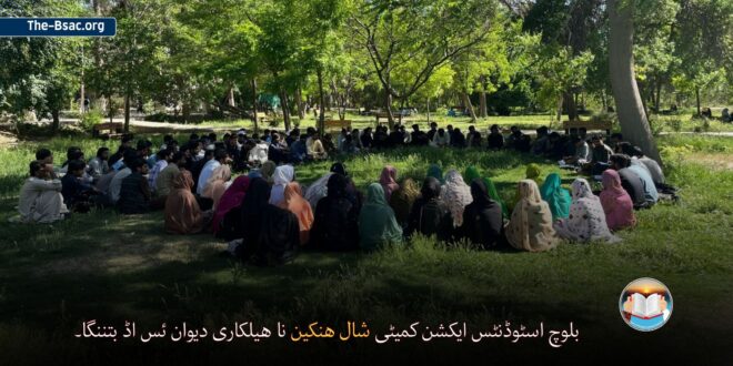 بلوچ اسٹوڈنٹس ایکشن کمیٹی شال ہنکین نا اسہ ہنکینی ہیلکاری دیوان ئس ہنکینی کارمستر سنگت ارشد بلوچ نا کماشی ٹی اڈ تننگا۔ دیوان نا مہمان بنجائی کمیٹی نا باسک سنگت پیر جان بلوچ، علی بلوچ و فہد بلوچ ئسر۔