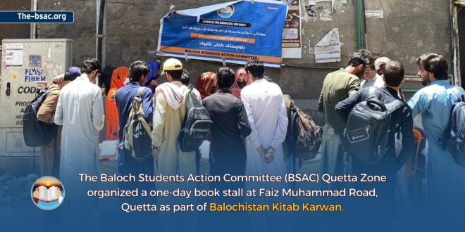 Baloch Students Action Committee (BSAC) Quetta (Shaal) Zone organized a one-day book stall at Faiz Muhammad Road, Quetta as part of the Balochistan Kitaab Karwan. A region which suffers from systemic educational crisis and corruption by the government, the members of BSAC organized a book stall under the banner of Balochistan Kitab Karwan, a widely recognized campaign which aims to provide access to education and literature across the region.