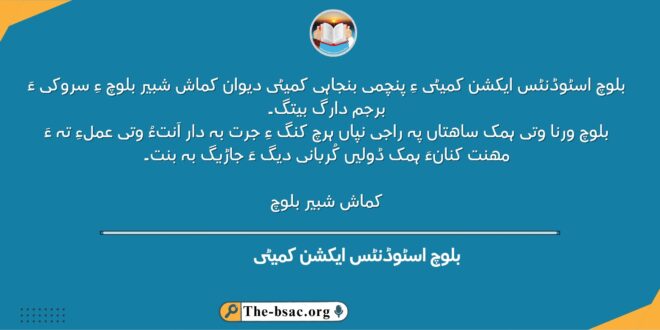 بلوچ اسٹوڈنٹس ایکشن کمیٹی ءِ پنچمی بنجاہی کمیٹی دیوان کماش شبیر بلوچ ءِ سروکی ءَ برجم دارگ بیتگ۔