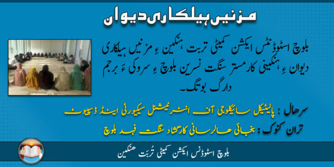 بلوچ اسٹوڈنٹس ایکشن کمیٹی تربت ہنکین ءِ مزنیں ہیلکاری دیوان ءِ ہنکینی کارمستر سنگت نسرین بلوچ ءِ سروکی ءَ برجم دارگ بوتگ۔ دیوان ءِ تہ ءَ مہمان بنجائی ھالرسانی کارگشاد سنگت فہد بلوچ ءُ بنجائی کمیٹی ءِ باسک سنگت نگرہ بلوچ بوتگ اَنت۔ دیوان ءِ سرھال بوتگ پالیٹیکل سائیکلوجی آف انٹرنیشنل سیکیورٹی اینڈ ڈسپیوٹ. تران کنوک بنجائی ھالرسانی کارگشاد سنگت فہد بلوچ بوتگ۔
