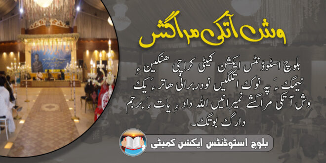 بلوچ اسٹوڈنٹس ایکشن کمیٹی کراچی ھنکین ءِ نیمگ ءَ پہ نوک اتکگیں نودربرانی ھاتر ءَ یک وش آتکی مراگشے نمیرانیں اللہ داد ءِ یات ءَ برجم دارگ بوتگ۔ مراگش ءِ تہ ءَ جتائیں بہر بوتگ اَنت کہ آ چو اے ڈول اَنت، تران، ڈیبیٹ، پیپر ریڈنگ، تھیٹر پلے، ڈاکیومنٹری، چاپ ءُ ساز ءُ زیملی بہر۔ اے مراگش ءَ بنجاہی کارگشاد پیرجان بلوچ، بنجائی ھالرسانی کارگوشاد فہد بلوچ ءُ بنجائی کمیٹی ءِ سنگت نگرہ بلوچ ءُ رحمان بلوچ ساڑی بوتگ اَنت۔ اے مراگش ءَ مہمان سّمی دین بلوچ گوں ہمراہاں ءُ عالم داد بلوچ اوں ساڑی بوتگ اَنت۔