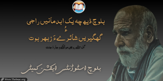 بلوچ ڈیھ چہ یک ابدمانیں راجی ءُ گہگیریں شائرےءَ زبہر بوت۔ اے دلسوزیں ھالءِ گوما گل سئے روچی موتکےءِ جارءَ جنت۔
