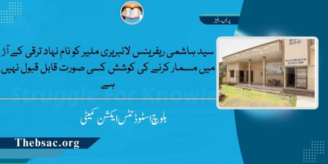 سید ریفرینس لائبریری بلوچوں کی قومی ادارہ ہے، اس قومی عِلمی مرکز کو اس طرح گرانے کی کوشش کرنا کسی صورت قابل قبول نہیں۔ ہم بطور بلوچ طلباء تنظیم یہ واضح کرتے ہیں کہ اس طرح کے علم دُشمن حرکتوں کے خلاف ہم اپنی پلیٹ فارم پر مزاحمت کریں گے۔ ہم حکام بالا سے یہی مطالبہ کرتے ہیں کہ وہ اس بلوچ دشمن پالیسی کو ترک کر دیں وگرنہ ہم اس کے خلاف بھرپور احتجاج کا حق رکھتے ہیں۔ اپنے بلوچ قوم کے نوجوان طلباء، استاد، ادیب و دیگر مکتبہ فکر کے لوگوں سے درخواست کرتے ہیں کہ وہ اِس کے خلاف آواز اٹھا کر اپنے قومی علمی اداروں کو بچانے میں کردار ادا کریں۔