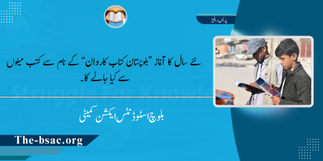 بلوچ اسٹوڈنٹس ایکشن کمیٹی کی طرف سے نئے سال کے آغاز پر بلوچستان کے مختلف علاقوں میں ”بلوچستان کتاب کاروان“ کے نام پر کُتب میلوں کا انعقاد کیا جائے گا۔ یہ کتب میلہ بلوچ طلباء کے لیے نئے سال کا تحفہ ہے جہاں بلوچستان کتاب کاروان انہیں وہ کتاب فراہم کرے گی جو کہ مارکیٹ میں ان کا ملنا مشکل ہے۔ بلوچ طلباء کے لیے مخلتف موضوعات پر کتابیں مختلف پبلشروں سے منتخب کرکے فہرست تیار کی گئی ہے جو کہ تنظیم کے اسٹال پر دستیاب ہوں گے۔ بلوچستان کتاب کاروان تنظیم کے بڑے پروگراموں سے ایک ہے جس کا مقصد بلوچستان میں کتاب کلچر کو پروان چڑھانا اور موجودہ تقاضوں کے مطابق لٹریچر دینا ہے۔ آج کی دنیا جہاں تیزی سے ٹیکنالوجی ترقی کررہی ہے جس کے سبب نوجوان کتابوں سے دور ہوتے جارہے ہیں یا ایسی کتابیں پڑھ رہے ہیں جو کہ بلوچ کے موجودہ مسائل کو حل نہیں کر سکتے۔