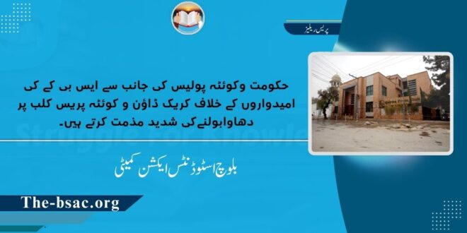 حکومت وکوئٹہ پولیس کی جانب سے ایس بی کے کی امیدواروں کے خلاف کریک ڈاؤن و کوئٹہ پریس کلب پر دھاوابولنے کی شدید مذمت کرتے ہیں۔